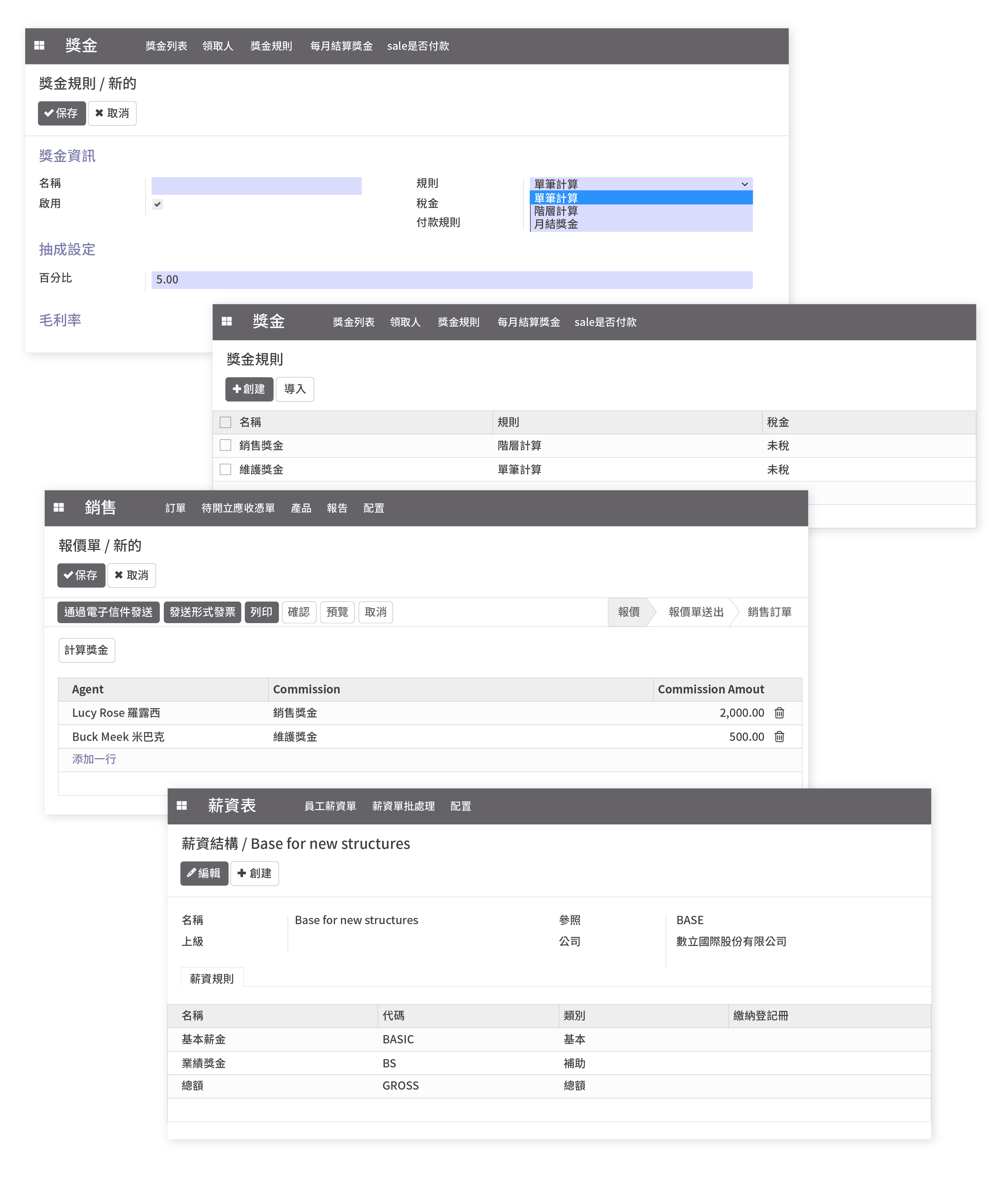 銷售獎金佣金的計算,往往都是人資最痛苦的工作,通過獎金模組擴充,綁定單一比率抽成或多階段的獎金計算規則,無論是結帳或收款完成的發放條件,都可以自行定義;在銷售訂單結算時,一鍵就能完成獎金計算。搭配薪資及人力資源模組,獎金金額會在正確的發放期間自動串接當月薪資表,節省約85%的重複作業工時,並且有效降低錯誤發生引來的勞資糾紛。
