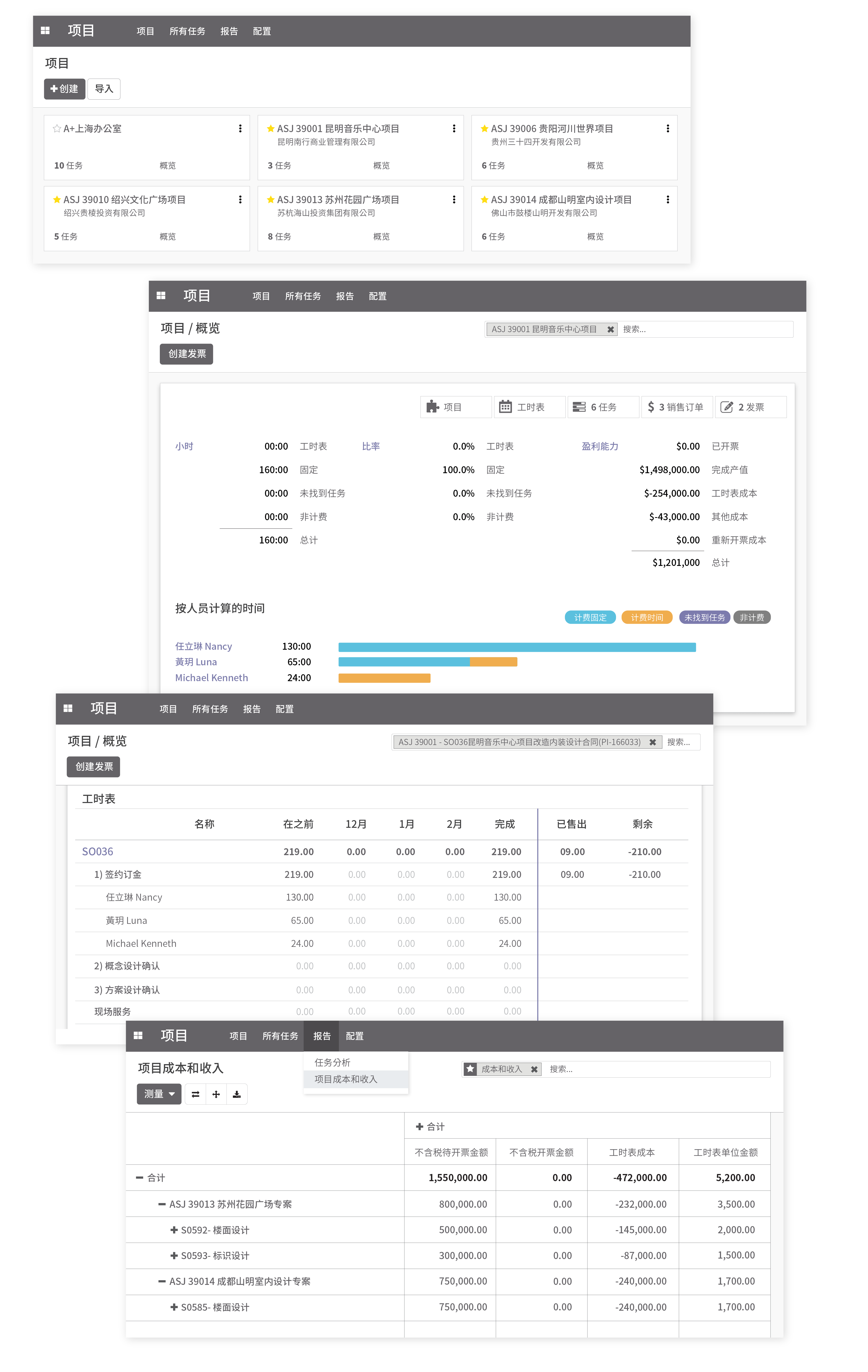 建築設計事務所等的服務類型產業,經常會同時有多項長期的專案進⾏並需要追蹤,看板式的拖曳管理介面,清楚劃分專案中任務的階段和更新進程;若任務即將到期,會透過顏色警示並發出通知提醒負責人員,提供專案經理與執行人員有效的溝通平台;透過概覽管理能隨時看到專案利潤,還可以立刻分析比較每個專案所投入⼈員/⼯作時數/盈利能⼒/預算數據。