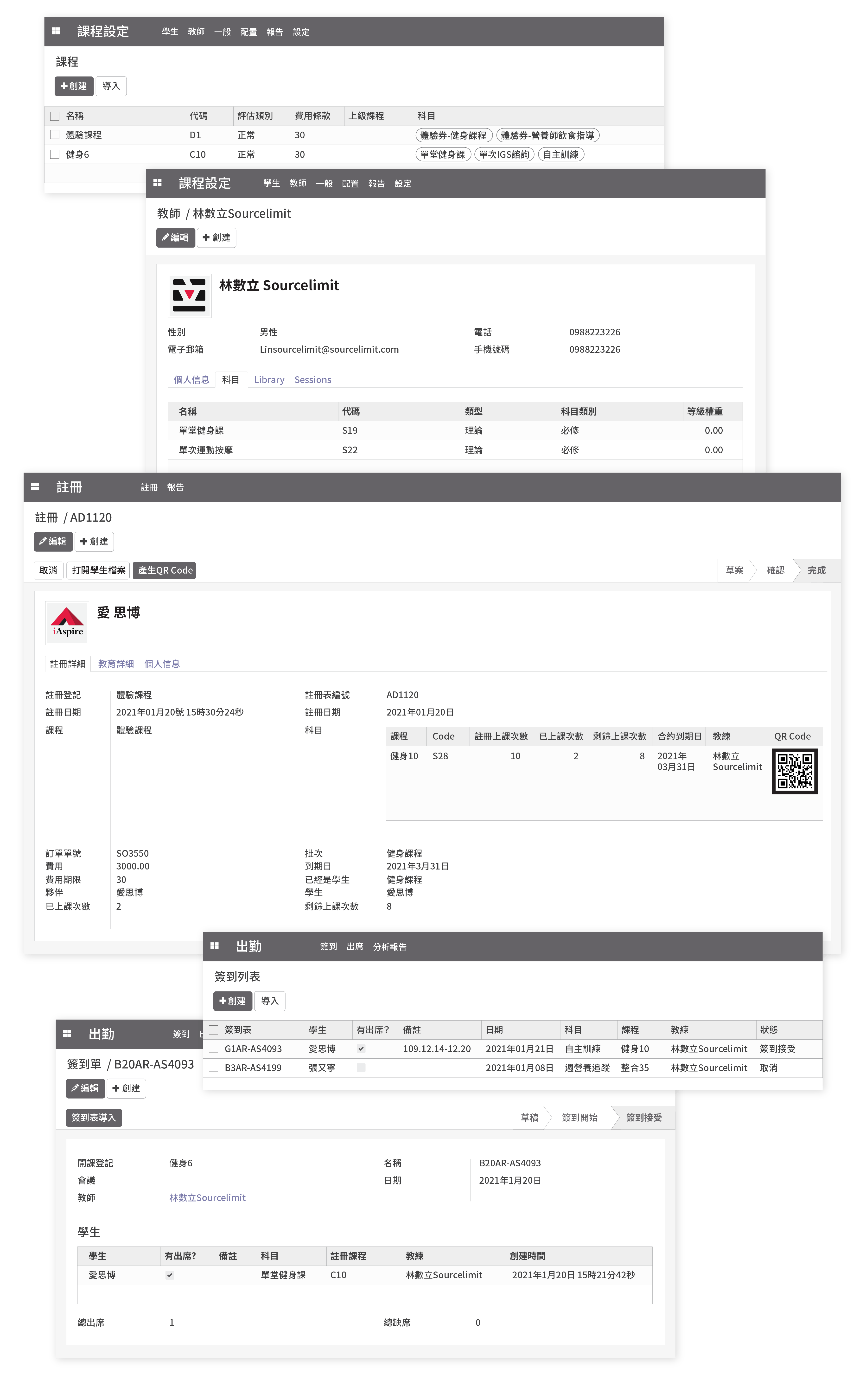 教育系統模組對於同時有課程、教師教練、學員的產業提供全面性的協助,從課程銷售訂單產生、學員註冊到實際授課,都有一站式的詳盡紀錄相互勾稽,讓教師教練或學員隨時查詢剩餘堂數,提升教育服務專業度;搭配專屬課程QR Code,掃碼1秒完成消課,降低行政單位作業時間。當管理者需要分析課程vs教師教練vs學員三方對應關係時,僅需要透過系統報表功能,就可馬上瀏覽不同緯度及⾯向的資訊,提供帳務處理及運營決策的財務數據。